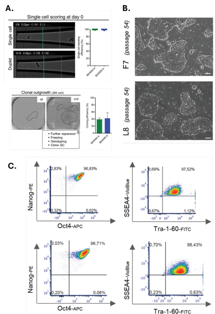 The cellenONE platform addresses the critical challenge of maintaining cell viability following stem cell cloning by offering a highly controlled, precise, and gentle method for single-cell isolation and dispensing. Unlike traditional techniques that rely on mechanical or pressure-based systems, introducing shear stress or physical trauma to delicate human pluripotent stem cells (hPSCs), cellenONE utilizes a non-contact piezo-acoustic dispensing technology. This gentle method significantly reduces cellular stress during handling, leading to improved post-dispensing viability and supporting optimal conditions for clonal outgrowth. In the study conducted by the Charité hospital’s team, the cellenONE system demonstrated exceptional performance in isolating and dispensing individual hPSCs with high single cell precision and minimal cell loss (Figure 1A). The result was a notably high survival rate of dispensed single cells, an essential factor in successful monoclonal line generation. Furthermore, the platform’s integrated imaging system enables real-time verification of clonality. Each dispensed droplet is imaged, allowing researchers to confirm that a single cell was deposited per well. This feature not only increases the reliability of downstream experiments but also accelerates decision-making by eliminating the need for time-consuming post-plating checks. These unique features of the cellenONE enable single cell cloning after gene editing and cell reprogramming in various workflows [2,3]