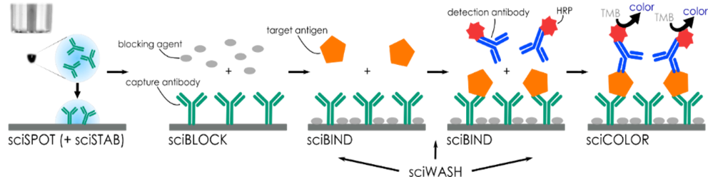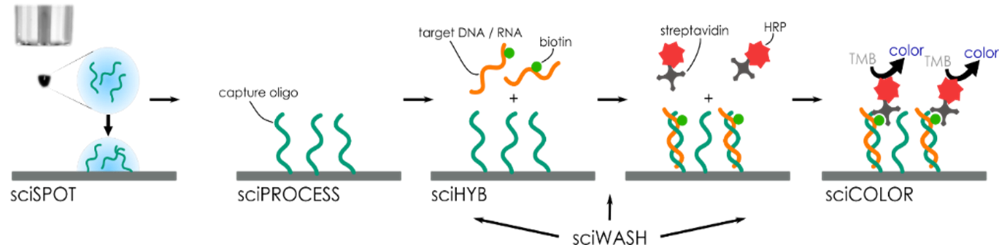 • sciBUFFER DNA workflow, for printing and hybridizing of long oligonucleotides and cDNA microarrays (amino and non-amino modified DNA samples), and sciBUFFER PROTEIN workflow, for printing of complex proteins and antibodies