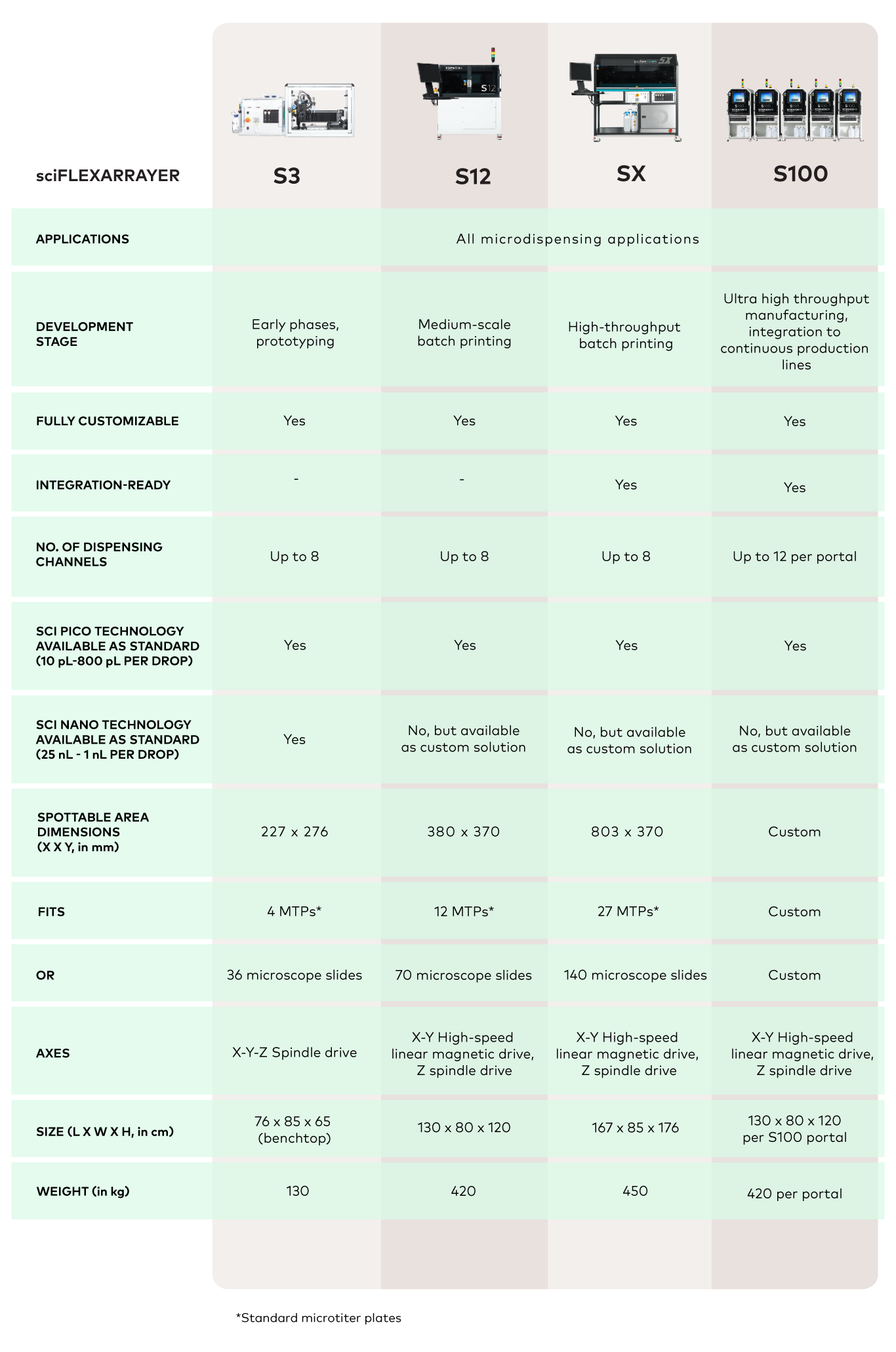 The sciFLEXARRAYER family includes the S3 (entry-level R&D system), S12 (medium-scale batch system), SX (high-throughput batch system), and S100 (customizable, ultra high-throughput system). All models share the same core technology based on Piezo-driven, non-contact microdispensing capillaries (PDCs), enabling accurate and reproducible spotting of a broad range of liquids on various substrates.