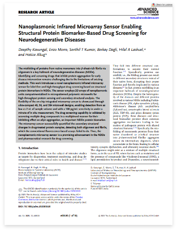 Published in Advanced Science (2025), the work showed that these plasmonic microarrays quantify protein secondary structures in real-time from as little as 2 nL perwell, with sensitivity down to 100 pg/mL. The arrays offered a new quantitative tool for screening neurodegenerative disease therapeutics with unmatched speed and resolution.